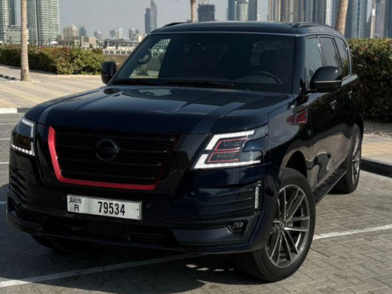 Experience the Nissan Patrol NISMO in the UAE – a full-size luxury SUV with a striking black exterior and red accents, highlighting its sporty NISMO-inspired design. Known for its robust performance, off-road capabilities, and advanced technology, the Patrol NISMO delivers both power and comfort for every journey.